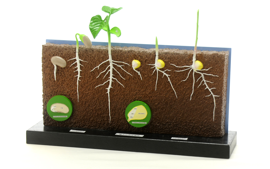 インゲンとトウモロコシの双子葉・単子葉(芽・葉の部分は取り外し可能)の各3段階の立体発芽模型です。