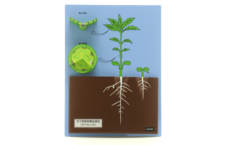 双子葉植物(ホウセンカ)の子葉や根(主根・側根)の様子を示した模型です。
